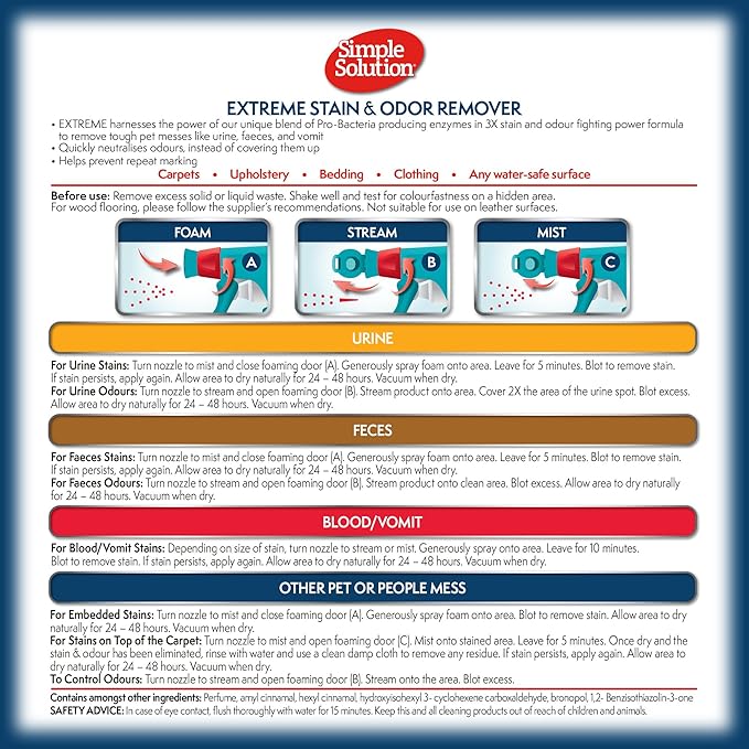 - PET STAIN AND ODOR REMOVER: Things can get a little messy when your pet is involved - that’s where we come in; This extra-strength cleaning solution is specially formulated to tackle the toughest smells & dirtiest spots left behind by your beloved pets.
