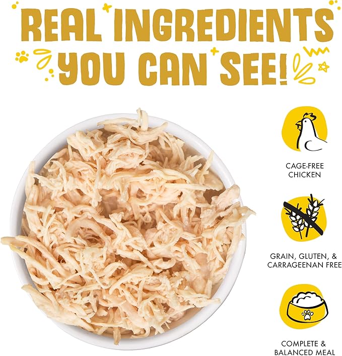 - Paw Lickin’ Chicken (3oz cans, pack of 24) Featuring thinly shredded, cage-free boneless, skinless white-meat chicken in a delicious gravy. Our most popular flavor!