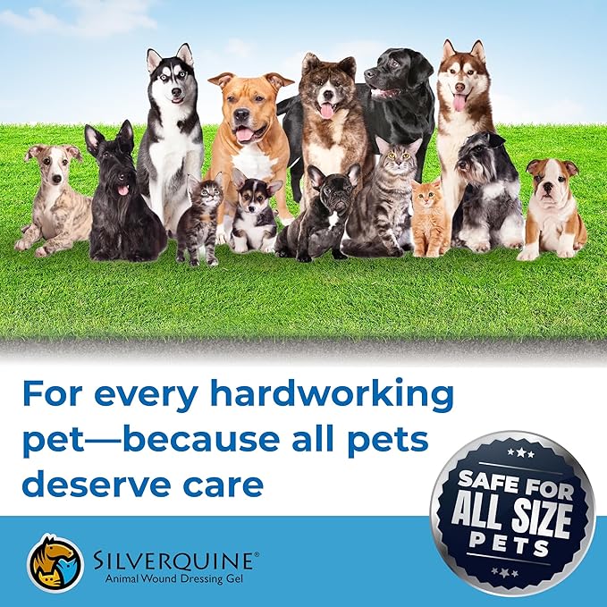 - ENHANCED RESTORATION WITH LONG-LASTING PROTECTION: Silverquine hydrogel provides constant moisture to minimize scabbing and scarring issues. Single application offers 24-72 hour duration. Excellent for dog hot spot gel, cat wound ointment needs, and itch solution for dogs. Easy to clean without sticking to fur or skin. Provides cooling effect for pet emergency situations, reducing pain and burning sensations while promoting natural restoration.