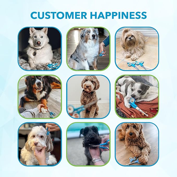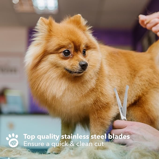 - Top Quality Stainless Steel Blades - The sharp steel blades of these dog scissors for grooming face and paws and Body ensure a clean cut for a quicker grooming session, no matter how tangled the fur is.