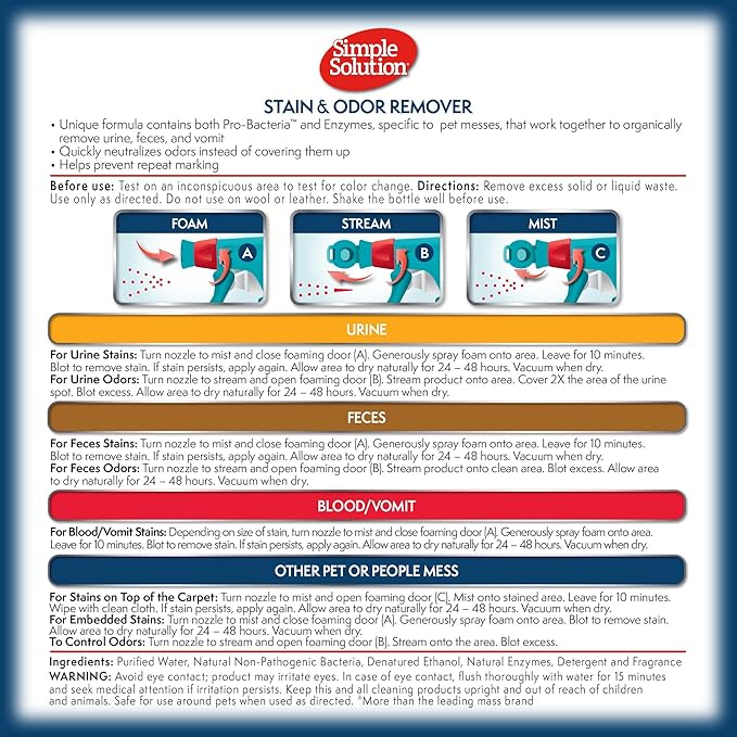 - removes pet stains - simple solution floral fresh pet stain & odor remover eliminates and neutralizes tough pet stains and odors such as urine, feces, or vomit, leaving behind a pleasant floral scent.