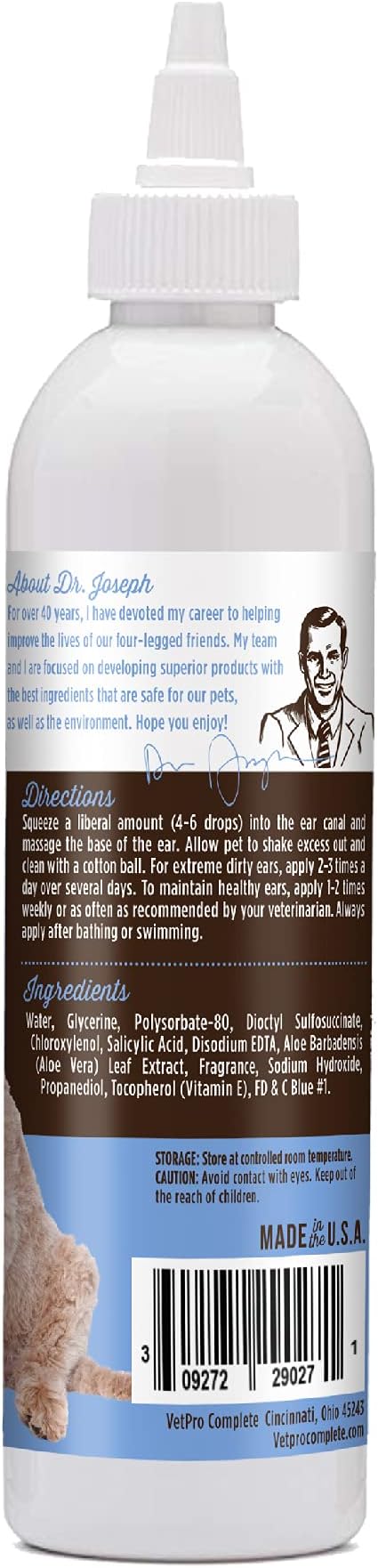 VetPro Complete Dr. Joseph's Dog Ear Cleaner, 8 Ounces, Gentle Dog and Cat Ear Rinse Solution Wash with Aloe Vera and Vitamin E, Dog Ear Drops to Remove Wax and Debris, Reduces Odor, Easy Applicator