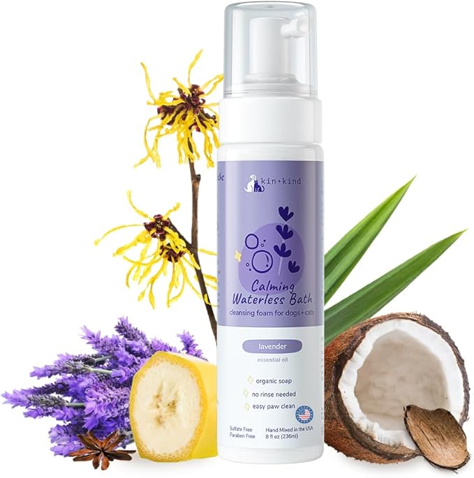 kin+kind Waterless Dry Shampoo for Dogs - Rinse-Free, Eliminate Itch and Odor, Natural Formula with Witch Hazel, Coconut Oil, Olive Oil and Lavender - Made in USA