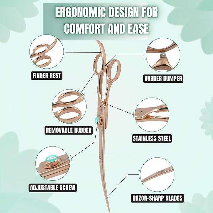 Kenchii Rose Dog Grooming Scissors, 8 Inch Curved Shears, Dog Scissors for Grooming, Ergonomic Design for Comfort and Precision, Heavy Duty, Durable and Sharp