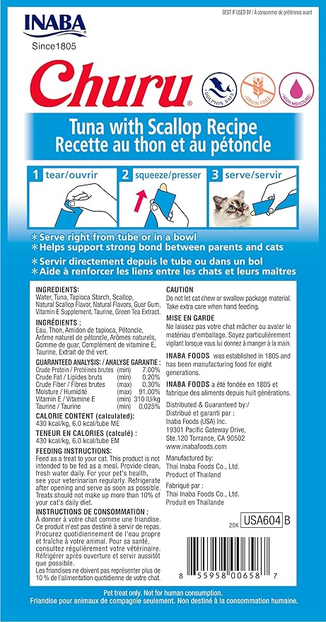 INABA Churu Cat Treats, Grain-Free, Lickable, Squeezable Creamy Purée Cat Treat/Topper with Vitamin E & Taurine, 0.5 Ounces Each Tube, 48 Tubes (4 per Pack), Tuna with Scallop Recipe