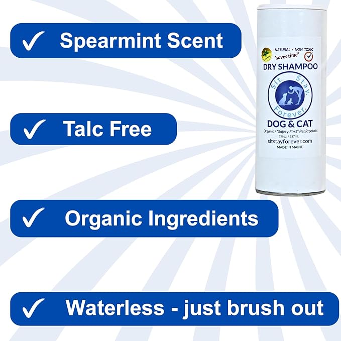 Sit. Stay. Forever. Dry Shampoo for Dogs & Cats – Organic Dry Bath Powder, Talco para Perros, Hypoallergenic, Odor Control for Smelly Dogs, No-Rinse, Anti-Itch, Safe & Natural, Made in The USA, 7 oz
