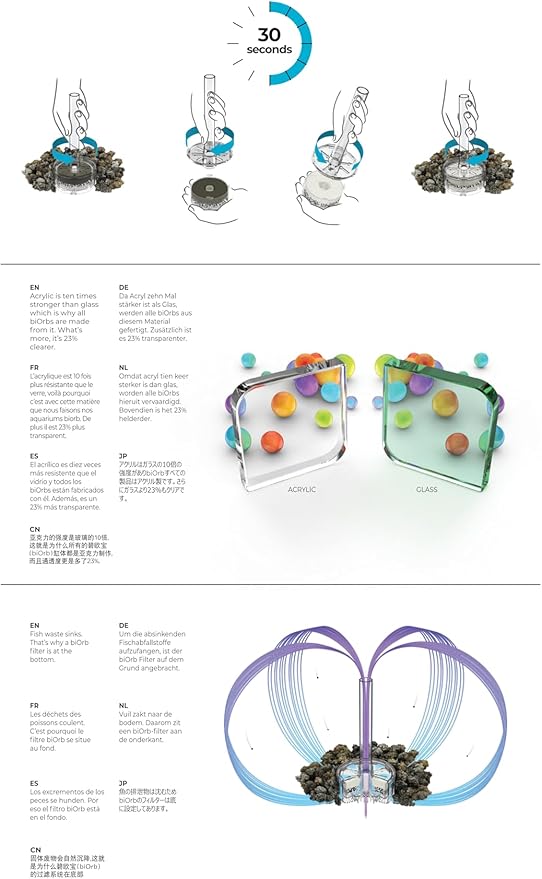 - DURABLE CONSTRUCTION — biOrb aquariums are made from acrylic, which is 10 times stronger, 50% lighter, and 23% clearer than ordinary glass aquariums. Acrylic is also a good insulator, so you don't lose as much heat as you would with a glass aquarium.