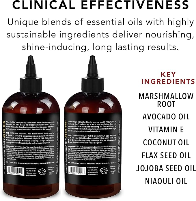 - MAIN INGREDIENTS: For THE SHEDDER (coconut oil, avocado oil, vitamin E, flax seed oil, jojoba seed oil, and aloe); for THE FINAL COAT (marshmallow root, lavender, sage, safflower seed oil, and hemp seed oil). All natural, free sulfates & parabens.