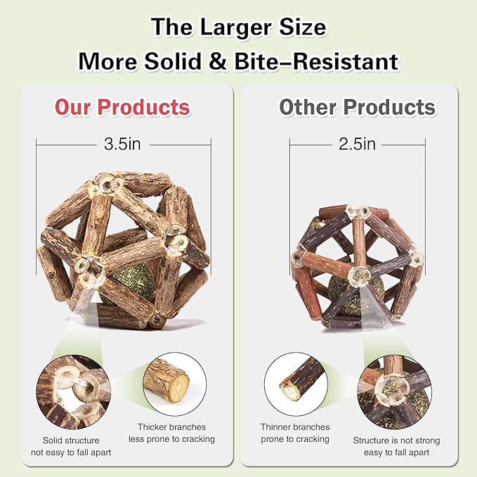 - 【Promote digestion, recycling】Both silvervine stick and catnip can improve cat’s digestive system, thus increase cat’s appetite. The skin on the silvervine stick will fall off and deteriorate after chewing, just use a knife to peel off the skin after a period of time to turn It into a brand new silvervine catnip ball, which can be recycled without wasting.
