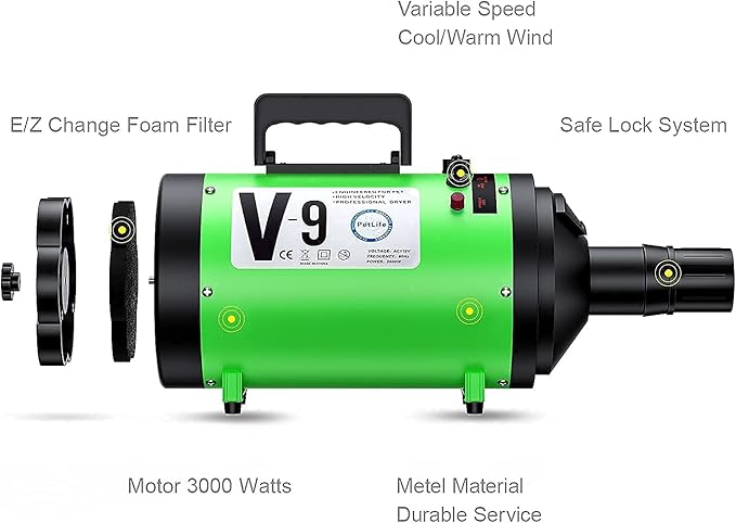 - QUICK DRY : PetLife dog grooming dryer equipped with a powerful and stable motor provides strong wind, could quickly dry your dog and save 50% time. The wind volume is adjustable, you can control the speed to your preference.