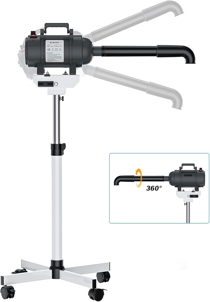 - Comes with these accessories: stand, straight hose with 360 degree rotating nozzle(hands-free rigid arm), flexible hose, and four dryer nozzle. Easily converted to a hands-free dryer using the included hands-free arm. It allow you hands free operation.