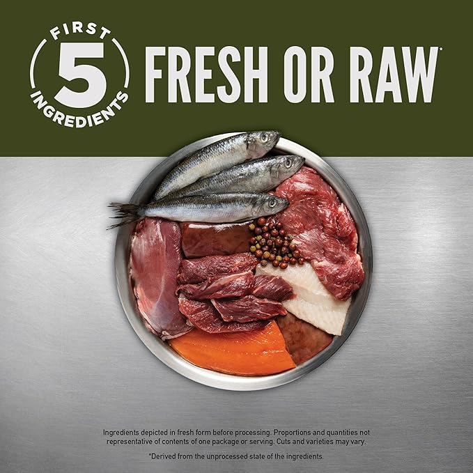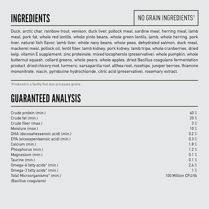 - First six ingredients are fresh or raw*** duck, Arctic char, rainbow trout, whole pilchard, ranch-raised venison and pork liver