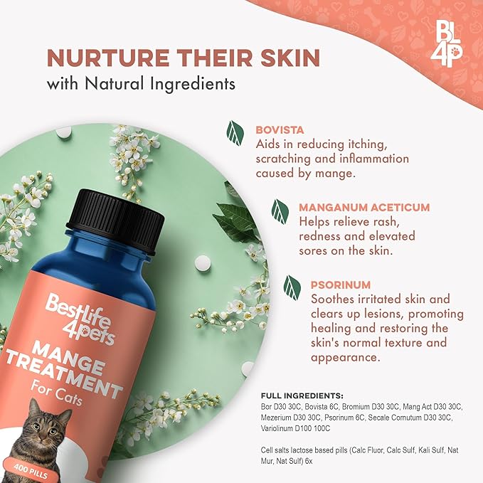 - Soothes Itching & Sores: Our Cat Mange and ear mites treatment for cats is like a cat first aid kit providing relief for felines struggling with scabs, lesions and crusty skin resulting from ear and skin mites. It not only helps heal the painful welts, but it also provides effective dry skin relief for cats, ensuring a more comfotable life for your cat.