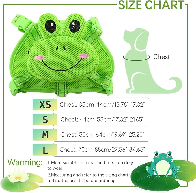 - LARGE CAPACITY:The dog harness backpack has a main bag with zipper design on the back, matches with cute green frog shape, which is eye-catching and have large capacity. The dog vest backpack can carry dog food and snacks, collapsible bowls and cups, small water bottles, toys and your keys.