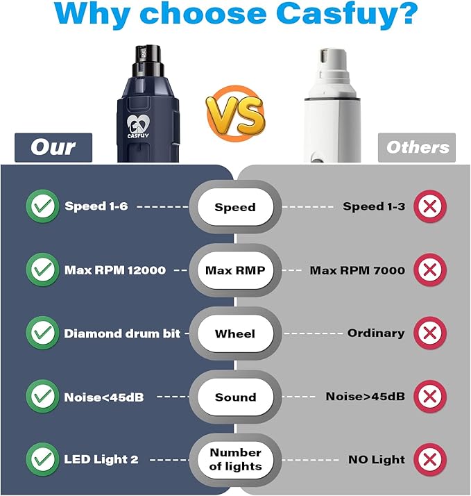 - Say goodbye to over-clip: Over-clipping is the worst during nail trimming. Dual LED lights on Casfuy electric dog nail trimmer will help you prevent it. The lights let you see the nail quick easier, making the grinding safer and more precise. The advanced diamond drum bit grinder will deliver the most comfortable pet claw grinding.