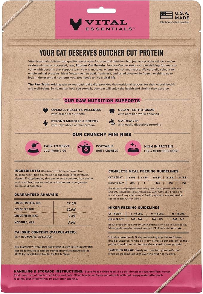 - CRUNCHY FREEZE-DRIED RAW CHICKEN CAT FOOD: Vital Essentials Crunchy Freeze Dried Cat Food packs more protein than industry standard into every bite to deliver the peak vitality your cat deserves, especially when compared to dehydrated cat food. This complete and balanced freeze-dried raw cat food is made with premium butcher cut chicken, responsibly sourced in the USA.