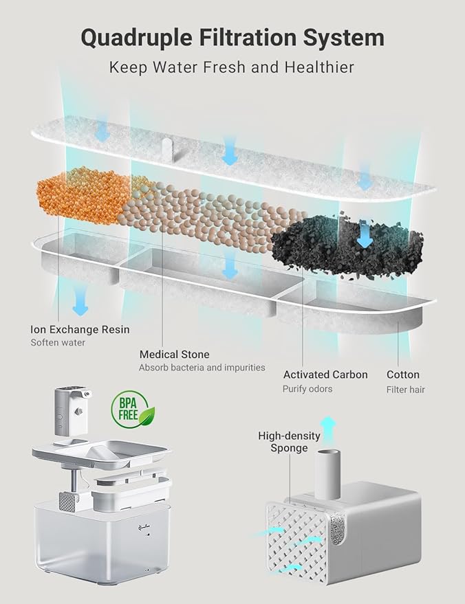 - Enjoy Every Sip of Fresh Water - The 5-level filtration system continuously provides fresh and healthy water to your pets. 1.Activated carbon removes bad taste and odor 2.Ion exchange resin could soften the tap water 3.Medical stone removes heavy metals and releases trace elements 4.Non-woven fabric could filter hair and impurities 5.The high-density sponge of pump helps remove fine particles