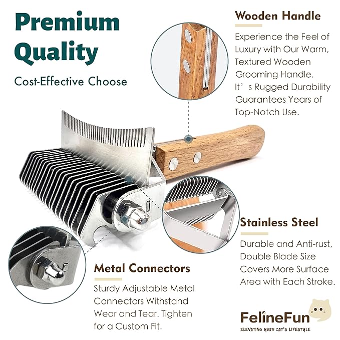 FelineFun Cat Brush for Dematting & Deshedding, 2 in 1 Undercoat Rake, Efficiently Remove Loose Hair & Matted Fur, Professional Shedding Comb for Indoor Cats & Long Haired Cats
