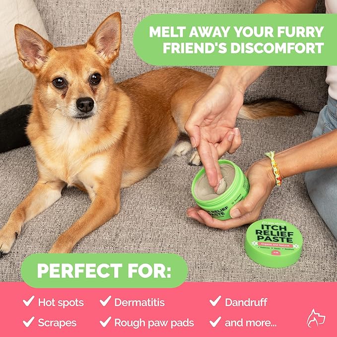 - This gentle yet powerful paste is the ultimate itch care solution for dogs - perfect for hot spots, scrapes, dandruff, rough paw pads, dermatitis, and more. Watch your furry friend's discomfort melt away