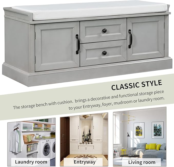 - The storage bench with cushion brings a decorative and functional storage piece to your Entryway, foyer, mudroom or laundry room. The distressed aluminum drawer handles can add an extra retro touch to your home.