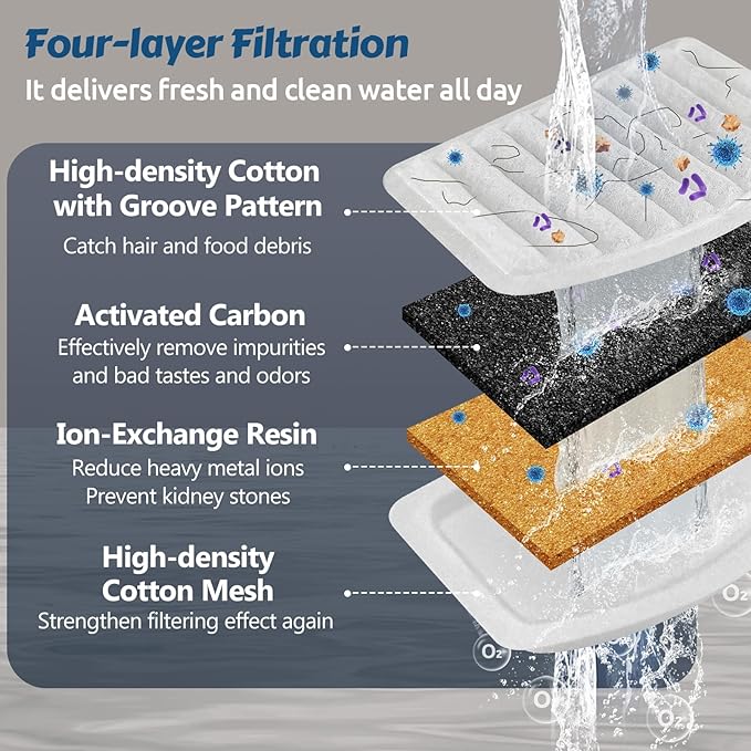 - 😽【Dual Filtration System】ORSDA cat fountain filters with 4-layers filtration- activated carbon, ion resin, double high-density ripple pattern cotton mesh, which can effectively filter out impurities, eliminate odors, combination with black pump sponges strengthen filter effect, delivering fresh and clean water 24/7 constantly.