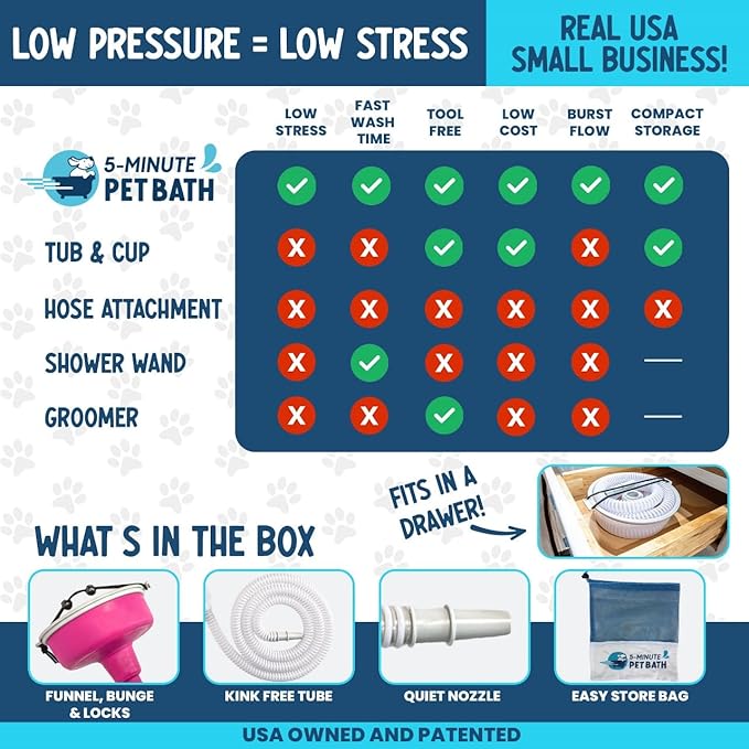 - EASY-TO-USE PET BATH ATTACHMENT – Designed to fit most shower heads, this portable dog bath hose attaches easily and stays in place while you clean. The low-pressure water flow helps with gentle rinsing and grooming, providing an effective indoor bathing solution for dogs that’s simple to set up and use.