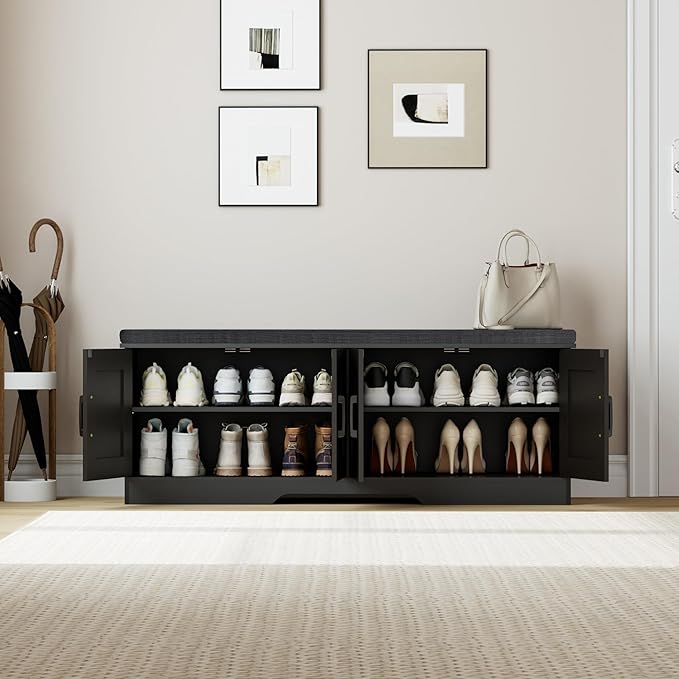 2-Tier Storage Bench, Shoe Bench with Padded Seat Cushion, Entryway Bench with 4 Barn Doors, Adjustable Shelf, 13.8" D x 47.2" W x 17.7" H, for Entryway, Living Room, Bedroom, Black