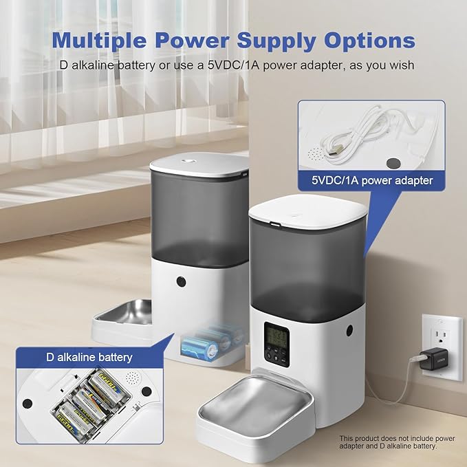 - 【Two power supply options available】- Use the 5V DC adapter while supplying the automatic cat food dispenser via 3 alkaline D-cell batteries(not included) installed in case of power outages, to ensure that your cat gets food consistently.
