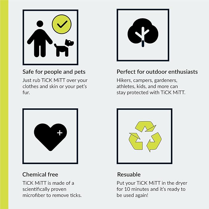 - REDUCES LYME DISEASE RISK: By efficiently removing ticks, the Tick Mitt helps minimize the risk of Lyme disease and other tick-borne illnesses, ensuring your peace of mind outdoors.