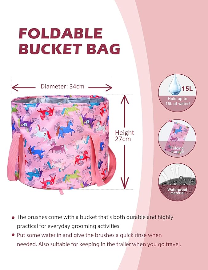 - Portable Water Bucket: The horse grooming set comes with a foldable tote bag that not only neatly stores all the brushes but also doubles as a mobile water bucket. This convenient feature allows for quick cleaning of brushes or your horse, eliminating the need to carry a separate bucket for on-the-go grooming.