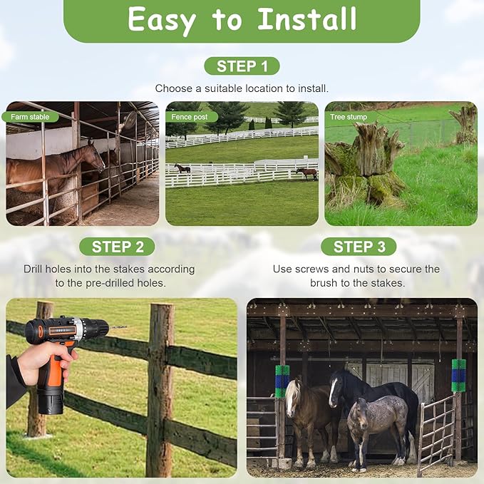 - Easy to install/disassemble, The goat brushes for grooming includes 2 brush and 8 screws. It can be installed in barns, pastures, livestock fences, horse sheds, trees, walls, or anywhere outdoors, and it is also easy to dismantle if you need to demolish it.