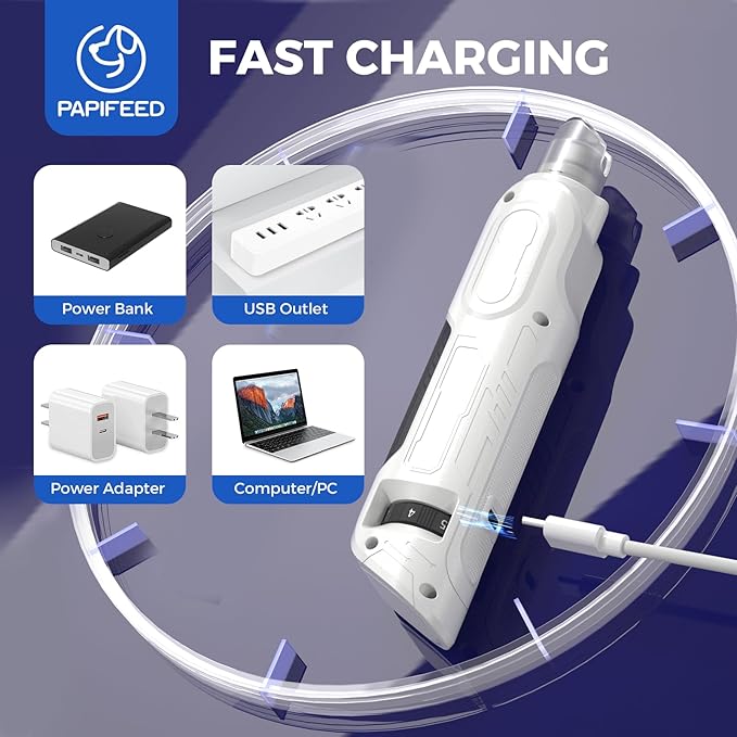 - 【Type-C Charging】The Type-C interface is compatible with mobile phone chargers, so you can charge it whenever you want, and say goodbye to the cumbersome replacement of traditional batteries. Using the PAPIFEED dog nail grinder, you can experience the convenience brought by continuous operation time and ultra-long standby time, providing an uninterrupted beauty process and flexible nail care.
