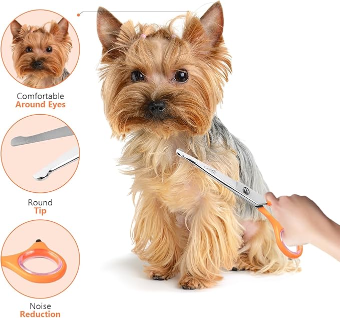 - Perfect for At-Home Grooming: Ideal for DIY pet grooming, these dog hair cutting scissors are perfect for trimming fur around sensitive areas like the face, paws, and tail, allowing you to maintain your dog hair cut between professional grooming visits.
