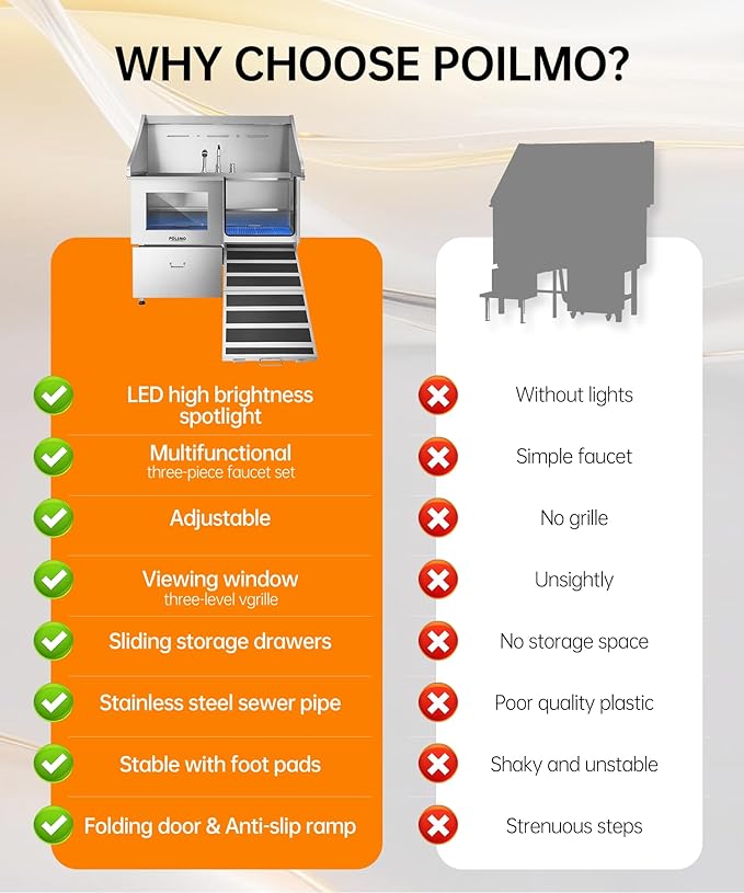 - Innovative and Practical Design: The POLIMO dog grooming station features multiple outstanding design elements: ① IP65 Waterproof high-brightness LED spotlight. ② Grade A tempered glass observation window. ③ The bathtub’s side panels feature a curved slide design, making it easier to operate④ Two-piece floor grid, adjustable to three different heights. ⑤ Sliding storage drawer for organized storage. ⑥ Multi-function faucet and showerhead, adjustable to left, center, or right positions.⑦ Two drainage options are available: one with a pet hair catcher and another stainless steel drain pipe featuring an odor-blocking S-trap design