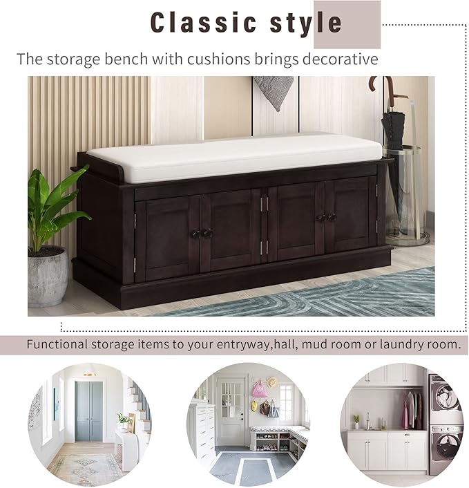 - Classic Style: The storage bench with cushions brings decorative and functional storage items to your entryway,hall, mud room or laundry room. There is magnetic attraction in the door and 4 round handles are simple and practical, which is convenient for you to open and close.