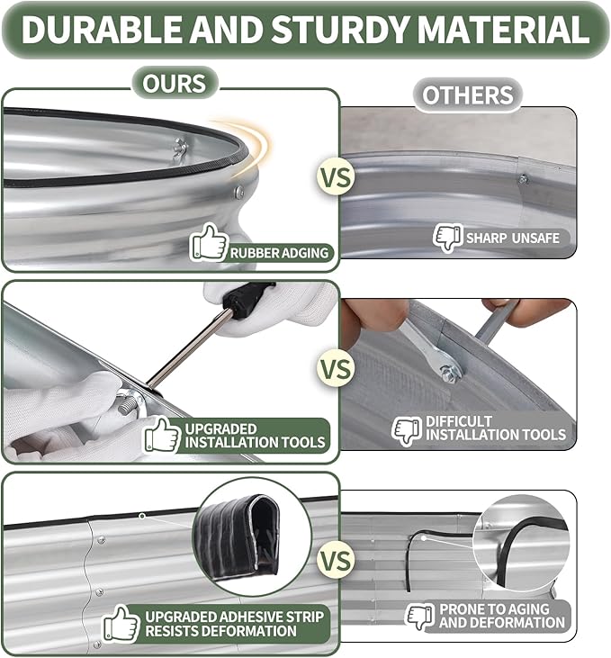 - 【High-Quality Materials & Durable】 Made from 0.5mm galvanized metal panels with double-layer anti-corrosion galvanization, this outdoor raised garden bed features a robust oval-shaped design for added strength and durability. Resistant to rust and corrosion, it provides a long-lasting gardening solution that can be reused for many years, ensuring a sustainable and reliable space for your plants to thrive