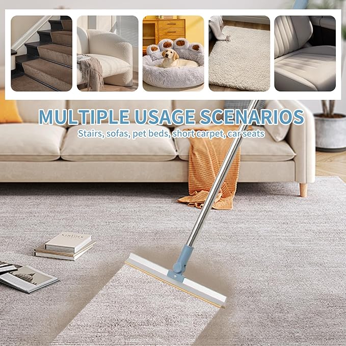 - PET HAIR RAKE KIT: This pet hair cleaning kit includes three cleaning tools, namely a retractable long-handled pet hair cleaning broom, a short-handled carpet rake and a double-sided silicone hair removal tool. The set can meet most household pet hair cleaning needs, allowing you to easily remove pet hair troubles at home