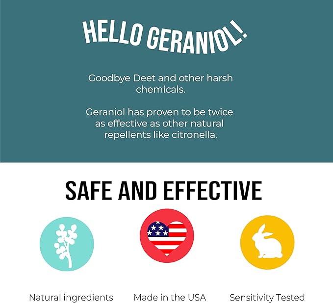 - NATURAL MOSQUITO SPRAY ALTERNATIVE - We feature Geraniol in our bug repellent which can fend off insects by binding with the General Odorant Binding Proteins in the insects’ antennae.