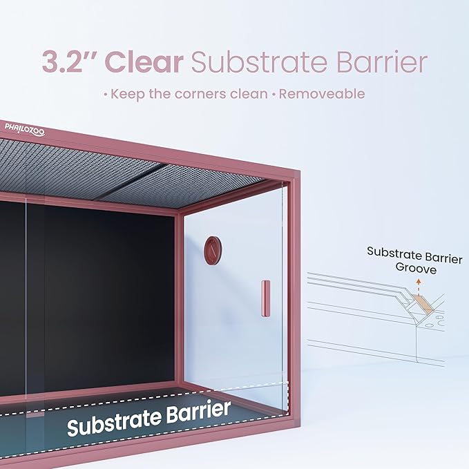 - 【Easy Maintenance】Front opening reptile terrarium with door handles included for easy cleaning & feeding. No more suction cup problems or unsightly fingerprints all over. The substrate barrier keeps the substrate in place. Our tempered glass doors are durable enough to withstand scratching.