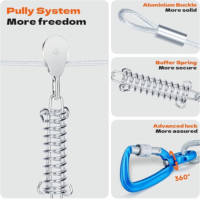 - Tangle-Free 100FT Dog Run CableSmooth-gliding pulley moves effortlessly along thick 5mm steel cable (vinyL-coated for weather resistance),creating a 3,000+sq.ft safe zone-3Xlarger than standard dog stakes for outside