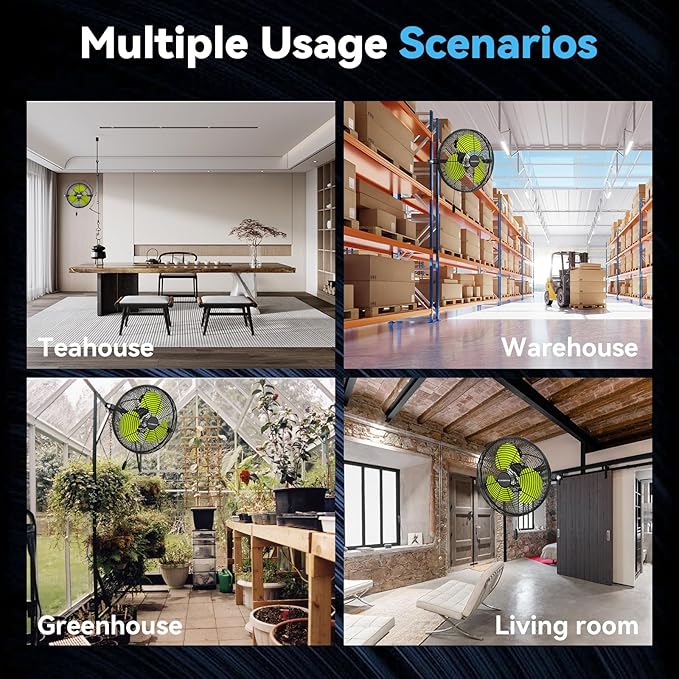 - 𝐋𝐨𝐰-𝐍𝐨𝐢𝐬𝐞 𝐃𝐞𝐬𝐢𝐠𝐧 - The black heavy-duty wall fan operates at a high speed of 9500 CFM with a noise level of only 65dB, which is lower than the industry standard, creating a quieter gathering or working environment