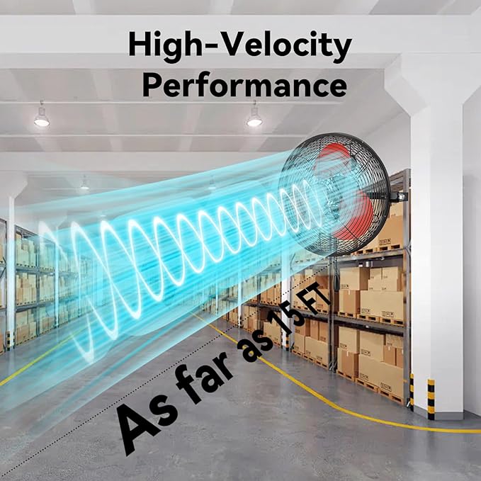 - Durable Constructions: Fanniverse wall mounted fan is made from tough powder coated steel housing and thick rust-resistant grille. Premium TEAO ball bearing motor. Extra-long 6 FT SJT waterproof power cord with 2 storage hooks. 0.55 AMPS, 2800 CFM, 120V, 62 Watts, 60 Hz, 1/10 HP. Meets OSHA and UL507 standards. UL safety listed.