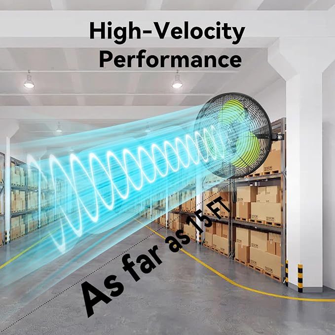 - Durable Constructions: Fanniverse wall mounted fan is made from tough powder coated steel housing and thick rust-resistant grille. Premium TEAO ball bearing motor. Extra-long 6 FT SJT waterproof power cord with 2 storage hooks. 0.55 AMPS, 2800 CFM, 120V, 62 Watts, 60 Hz, 1/10 HP. Meets OSHA and UL507 standards. UL safety listed.