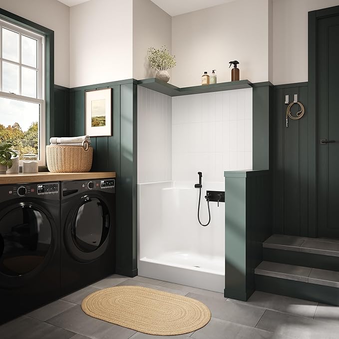 Laurel Mountain Odie 36" x 27" x 36" AcrylX Alcove Center Drain One-Piece Pet Shower in White with Hand-Held Sprayer in Matte Black