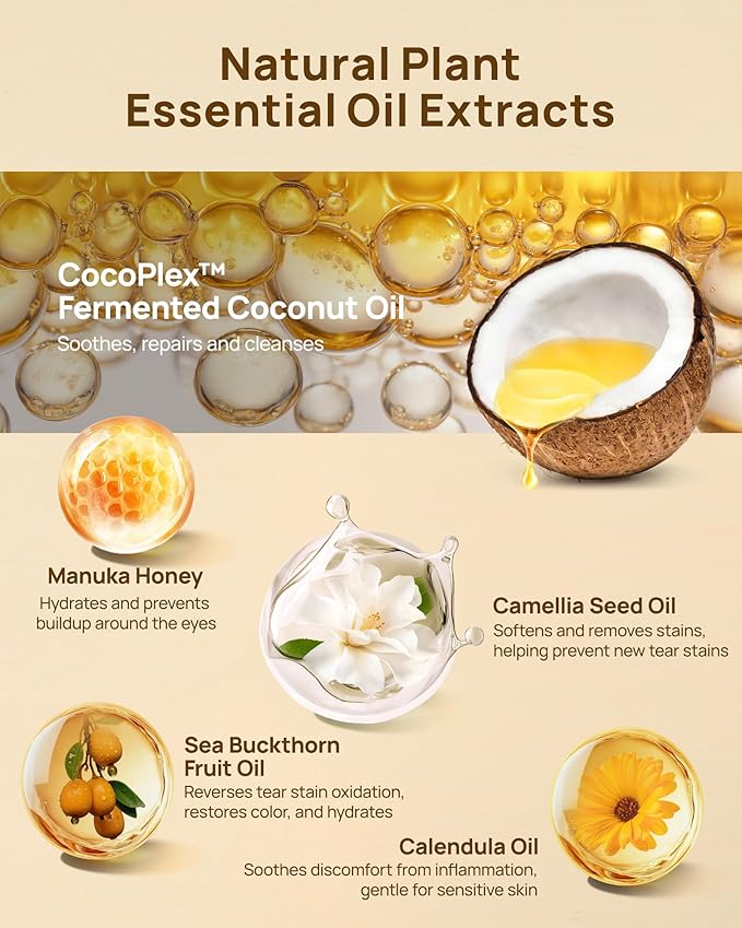 - Premium Natural Plant Essential Oils for Safe & Gentle Care - This vet-developed dog eye tear stain remover contains 10+ premium natural Plant Essential Oils, Including olive oil to soften stubborn stains, calendula flower oil to soothe inflammation, manuka honey for natural hydration, and shea butter to form a light, moisturizing film. It completes a full care cycle of "cleaning-soothing-repairing-protecting". It is free from harsh chemicals and suitable for daily use
