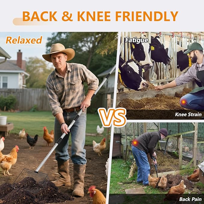 - 【Adjustable Handle Chicken Poop Rake (36", 44", 55", 67")】: Easily adapts to different heights and tasks (chicken coops, sandboxes, dog waste, horse stalls, etc.).The long handle (up to 68") minimizes bending, reducing back strain during cleaning.