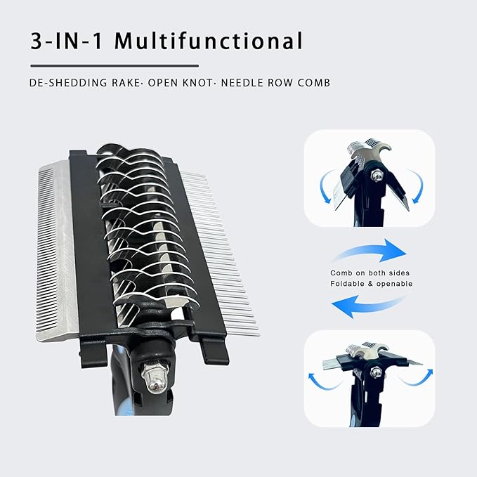 - 3-in-1 Multifunctional Design: Combines a deshedding brush, double sided undercoat rake, and dematting comb in one tool. Foldable sides adapt to thick coats or sensitive skin, perfect for dogs (huskies, golden retrievers) and cats (long-haired breeds like Persians)