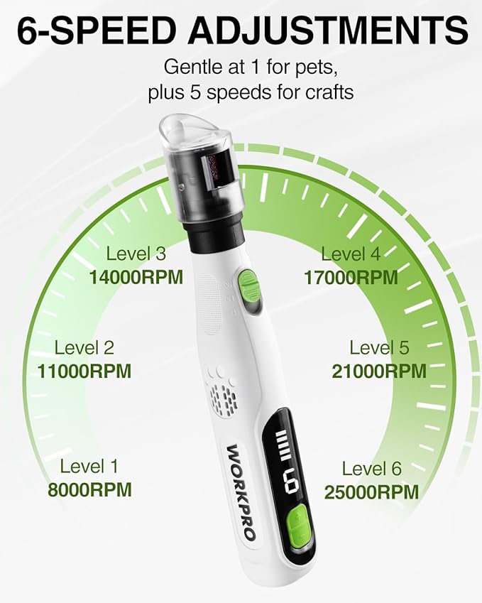 - 6-SPEED LEVELS: Quiet dog nail grinder with 6 speeds (8000–25000 RPM). Level 1 for safe nail grooming; other 5 levels for carving, sanding, polishing with 70 versatile accessories
