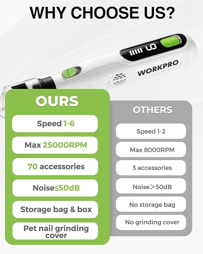 - SAFE & EFFECTIVE GRINDING: WORKPRO pet nail grinder quiet for dogs and cats includes sanding sheets for dogs and grinding wheels for cats. With the protective guard, it ensures safer, effective nail care for all pets