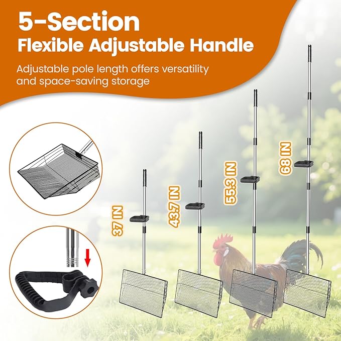 - 【Versatile Sifting & Scooping Tool】- Designed for large-scale coop cleaning, this adjustable-length shovel doubles as a leaf collector, beach sand sifter, horse manure scooper, and livestock pen cleaner. Its multifunctional design adapts to diverse tasks for poultry, pets, and farm animals.